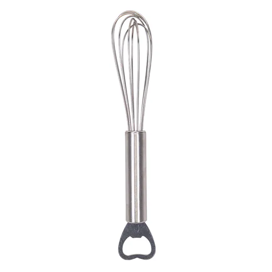 - Design multifuncional: batedor + abridor em um único utensílio