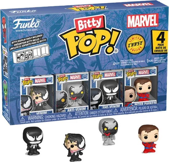 Especificações de Bonecos Venom/ Anti-Venom/ She-Venom/ Peter Parker - Marvel Funko Bitty Pop! 4 Pack