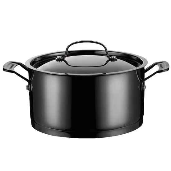 As alças de aço inoxidável permanecem frias sobre a placa de cozimento.