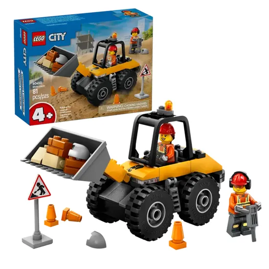 Inclui: Cargadora com rodas, minifiguras de motorista e trabalhador, placa de obra, cones de tráfego, martelo pneumático
