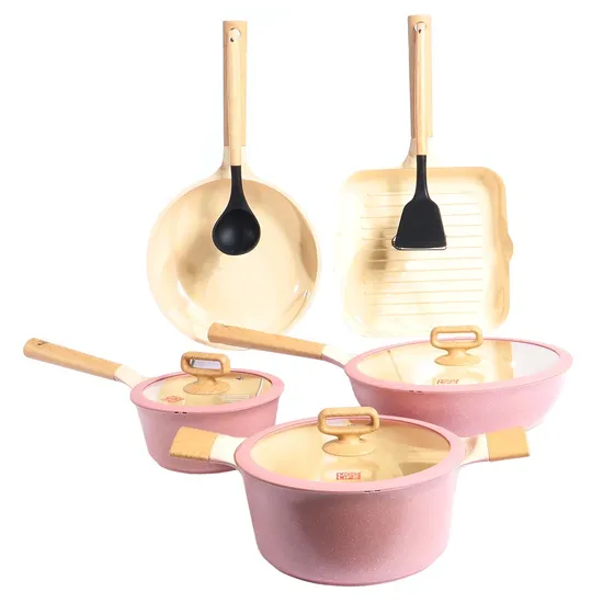 Conjunto de Panelas de Indução Ucc Life Rosa com 10 Peças: Panelas de 16/24 CM, Frigideiras de 24 CM, Wok de 28 CM, 1 Espátula e 1 Concha.