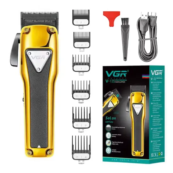 Alimentação: Bateria recarregável / USBCaracterísticasO VGR V-138 é um cortador de cabelos profissional projetado para proporcionar cortes precisos e eficientes tanto em uso doméstico quanto em barbearias. Seu motor potente e lâminas de alta precisão garantem cortes suaves sem puxar os fios, oferecendo acabamento uniforme e profissional.O equipamento possui estrutura metálica resistente e design ergonômico que proporciona maior conforto durante o uso prolongado, além de display LED para monitoramento do nível de bateria. Desempenho / TecnologiaMotor BLDC de alta durabilidade (até aproximadamente 10.000 horas de uso)