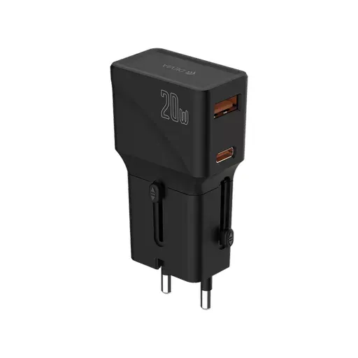 Devia Cargador G520 20W Fuente Usbc/ Usba Eu/ Uk/ Usa/ JP/ CN s/ Cable Black