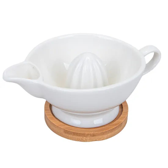 Esprimidor de Limão Em Porcelana com Base de Madeira