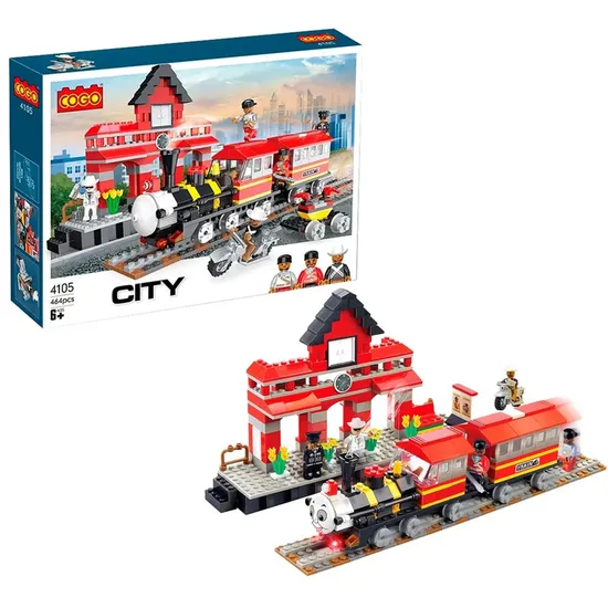 Estação de trens com trilhos, trens e acessórios decorativos
