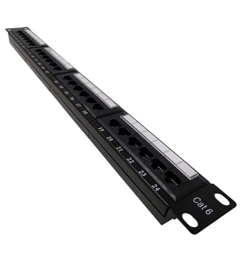 Os painéis Patch de montagem em rack são uma ótima maneira de organizar e terminar cabos no armário de fiação. A adição desses painéis aos racks permite fácil identificação e adições/alterações e modificações de fiação mais rápidas. Basta perfurar a fiação de par trançado na parte traseira do dispositivo e você estará pronto para conectar os cabos de conexão RJ45 à frente.