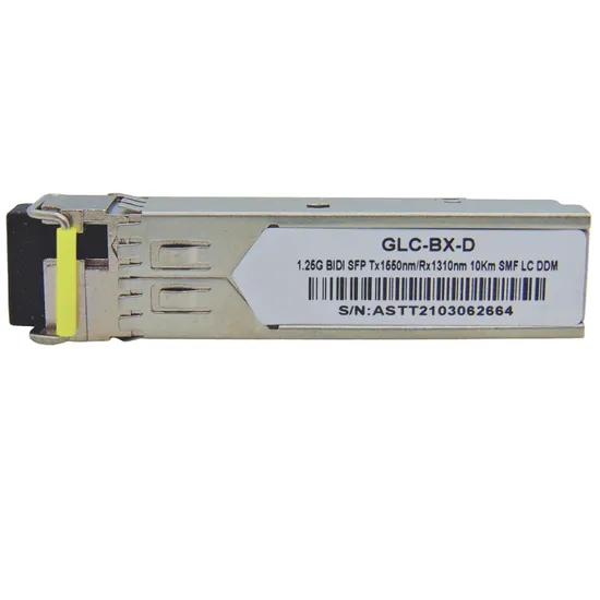 Este módulo transceptor 1G BiDi SFP compatível com Cisco® oferece desempenho 1000BASE-BX-D de até 10 km em um único fio de fibra monomodo (SMF). O módulo GLC-BX-D 1000BASE-BX10-D SFP opera em um comprimento de onda bidirecional de TX-1550nm a montante e RX-1310nm a jusante e deve ser usado com outro transceptor BiDi de comprimentos de onda complementares.