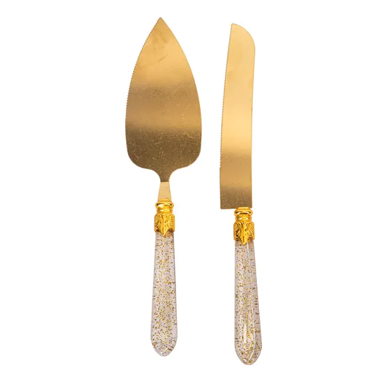 - Material: Aço inoxidável com acabamento dourado + cabo acrílico com partículas de brilho