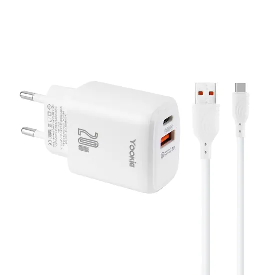Fonte Carregador Yookie EI3Y - 20W - USB/USB-C - com Cabo USB-C - Bivolt - Branco