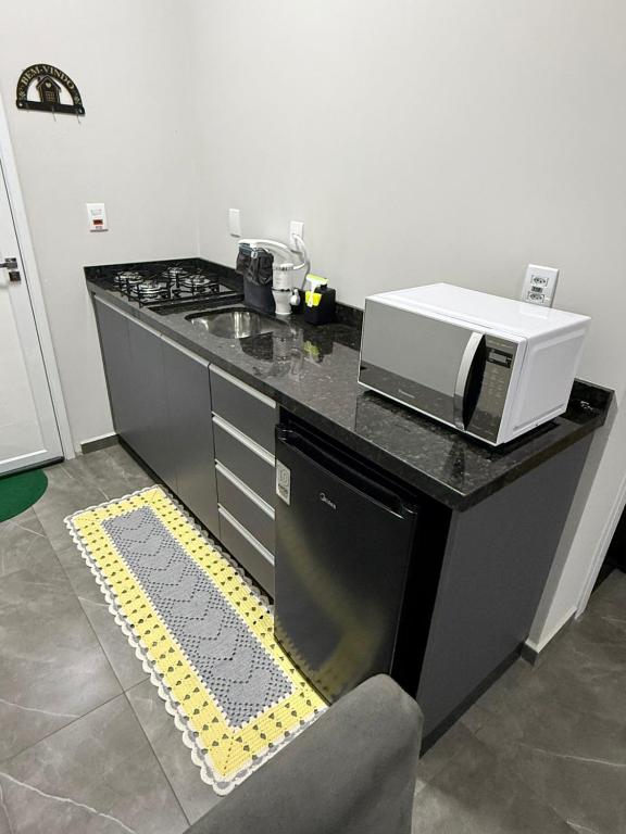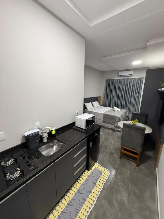 O apartamento tem 1 quarto, cozinha completa e 1 banheiro.
