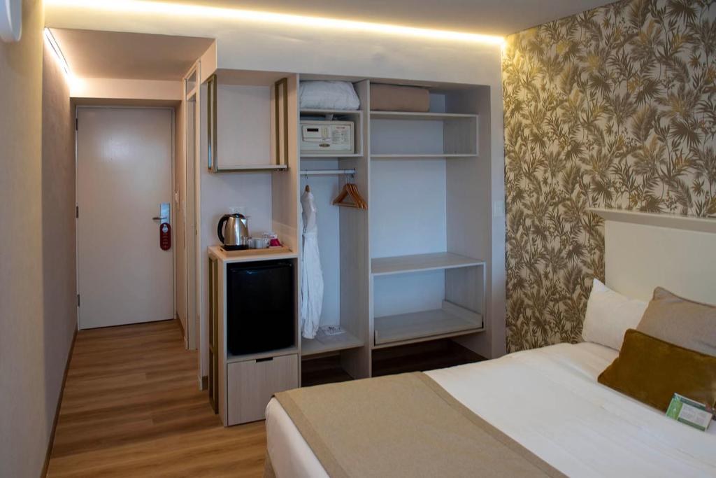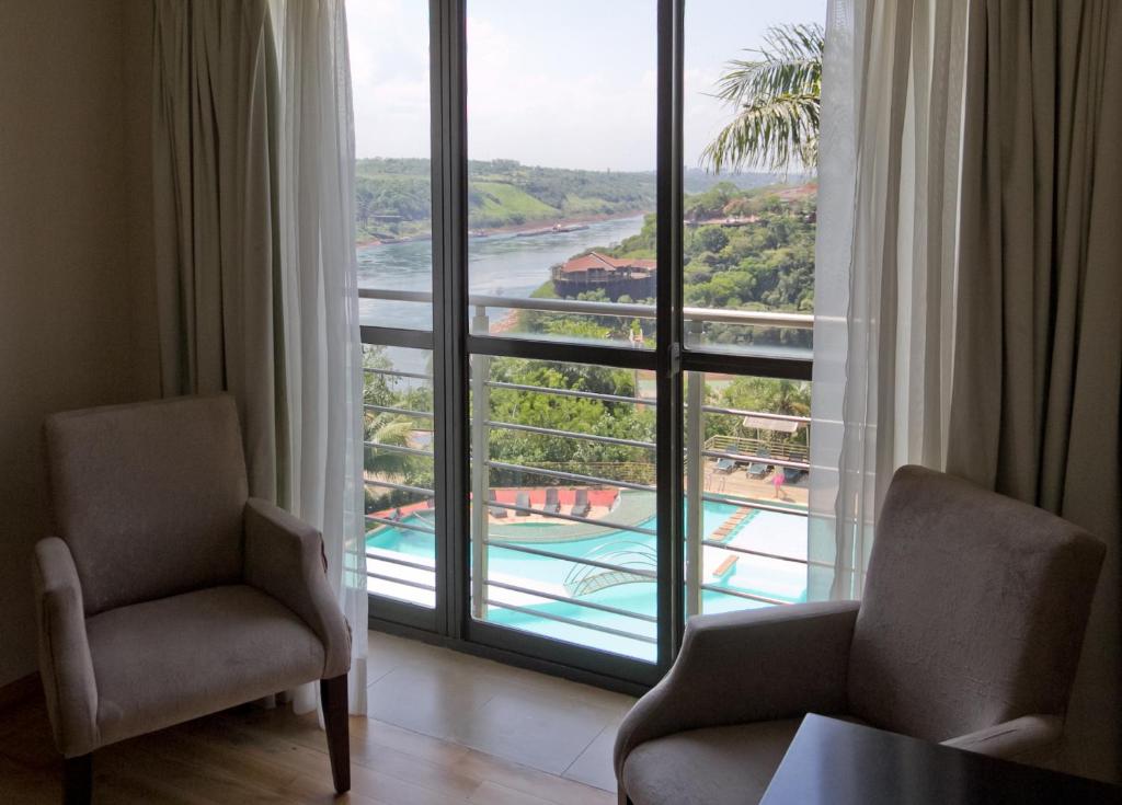 Os quartos do Amérian Portal têm decoração em tons suaves, TVs de plasma e varandas privativas com vista do rio ou do jardim.