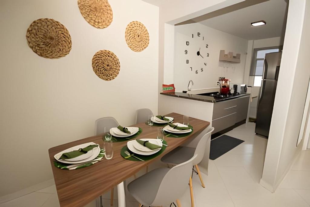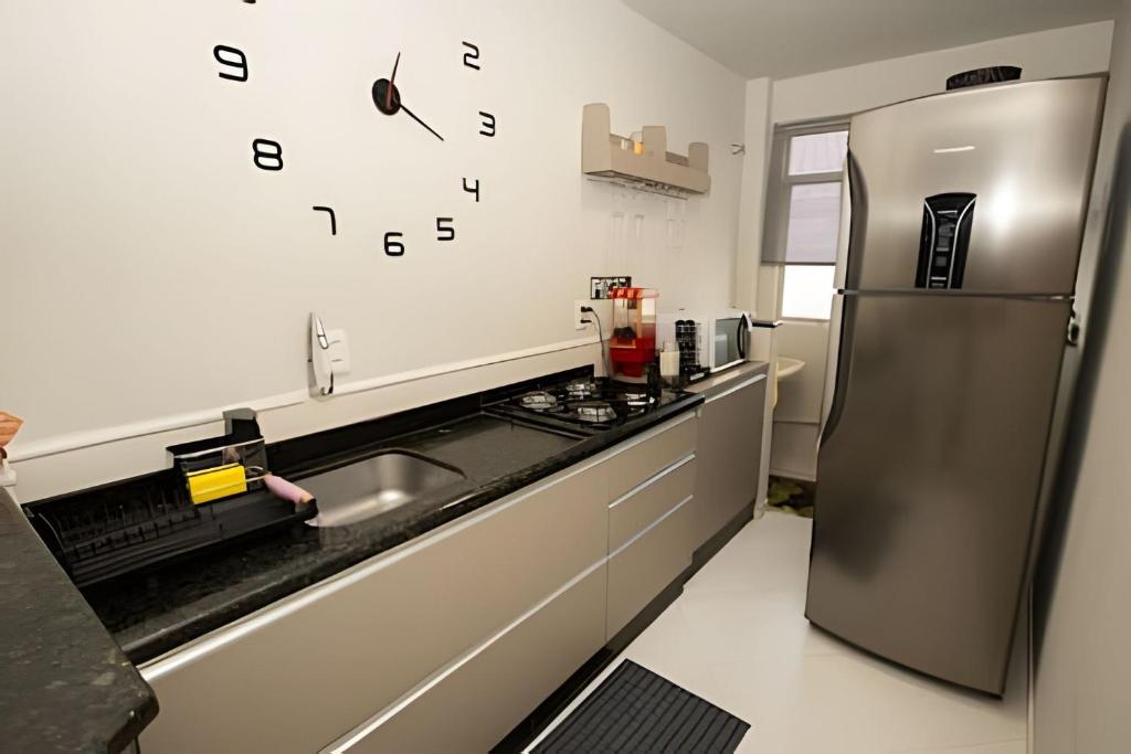 O apartamento tem 2 quartos, cozinha completa e 1 banheiro.