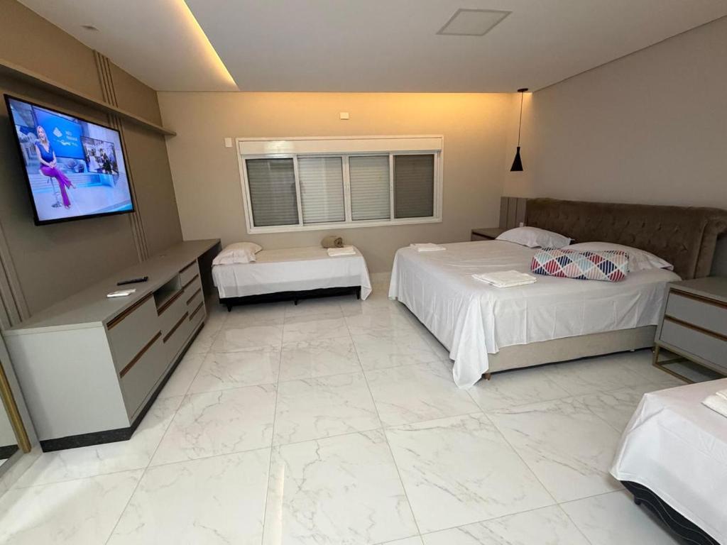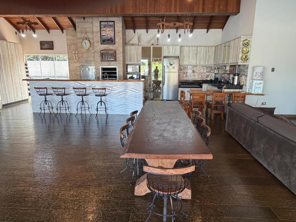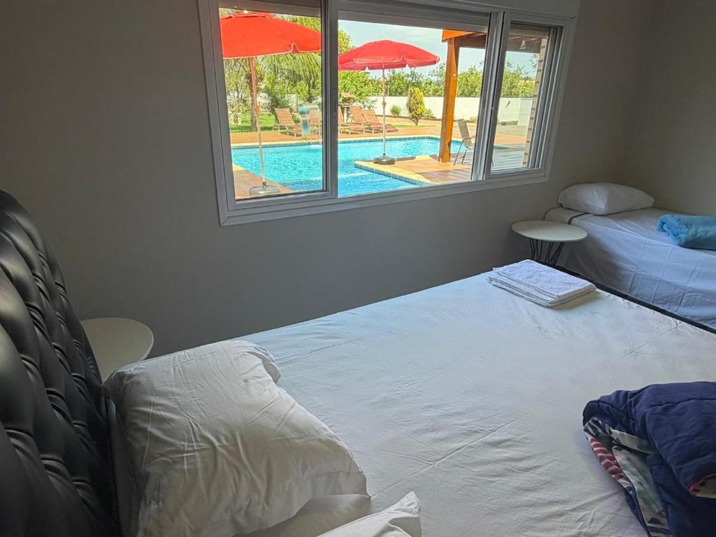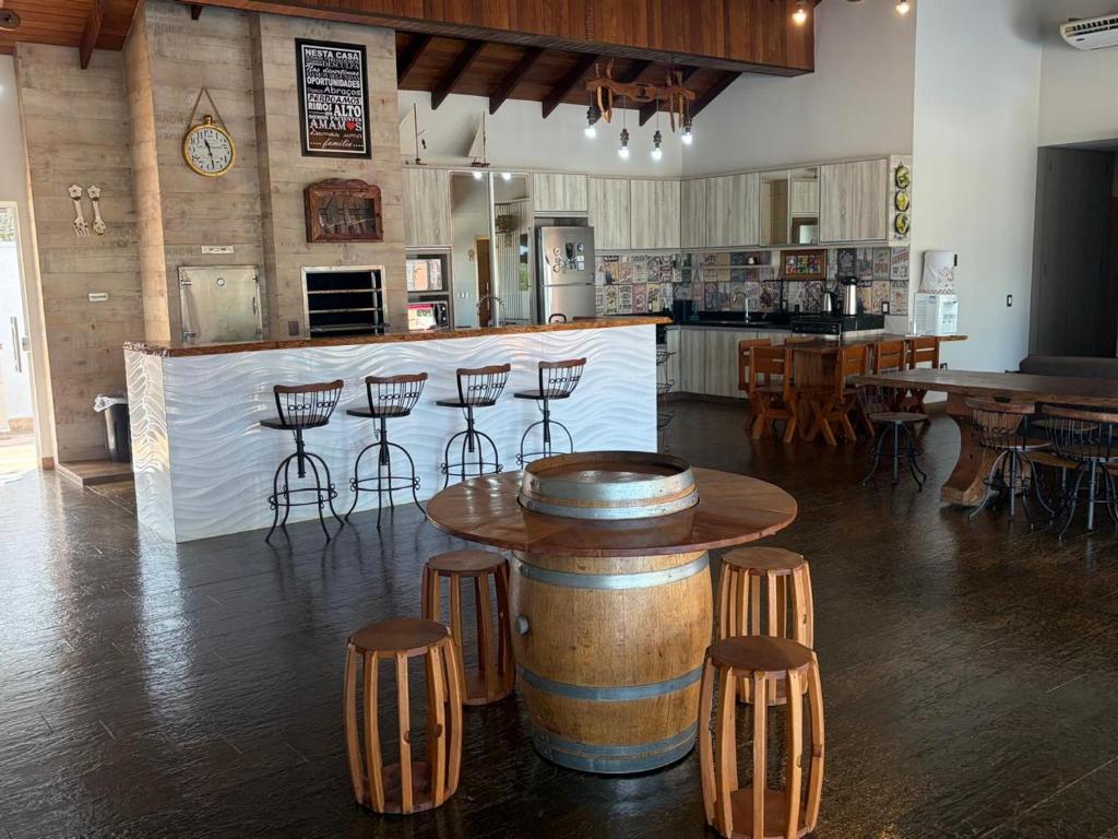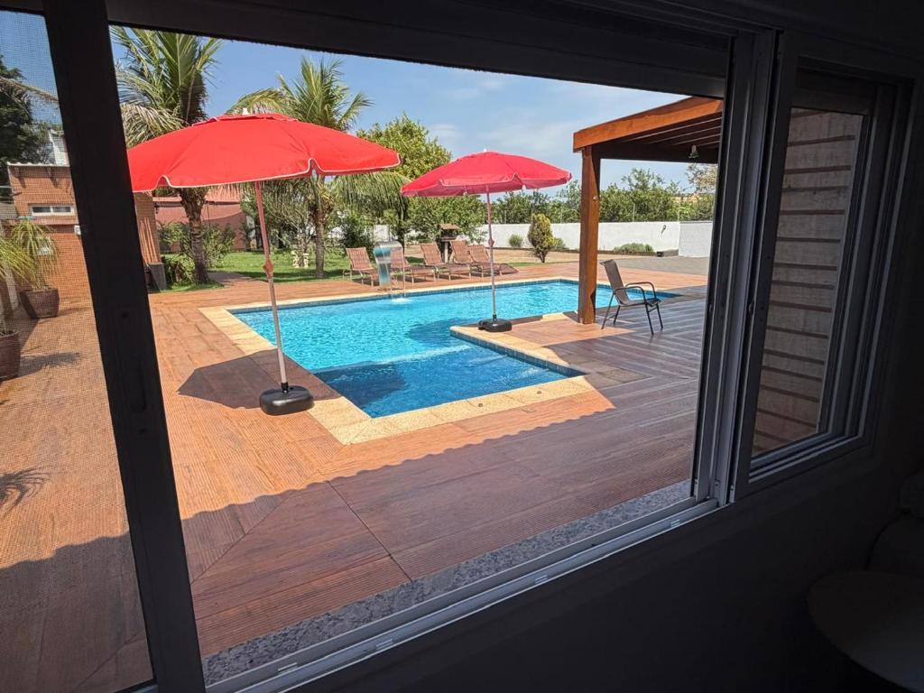 A casa de temporada oferece 3 quartos, 4 banheiros, roupa de cama, toalhas, TV de tela plana, cozinha completa e varanda com vista para a piscina.