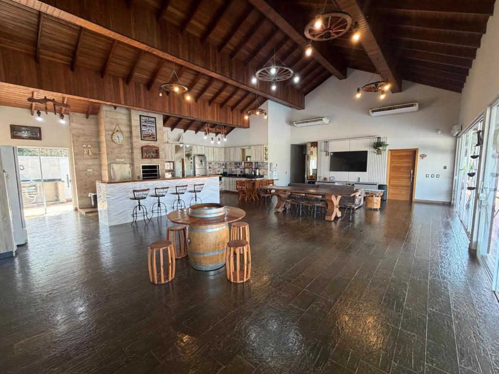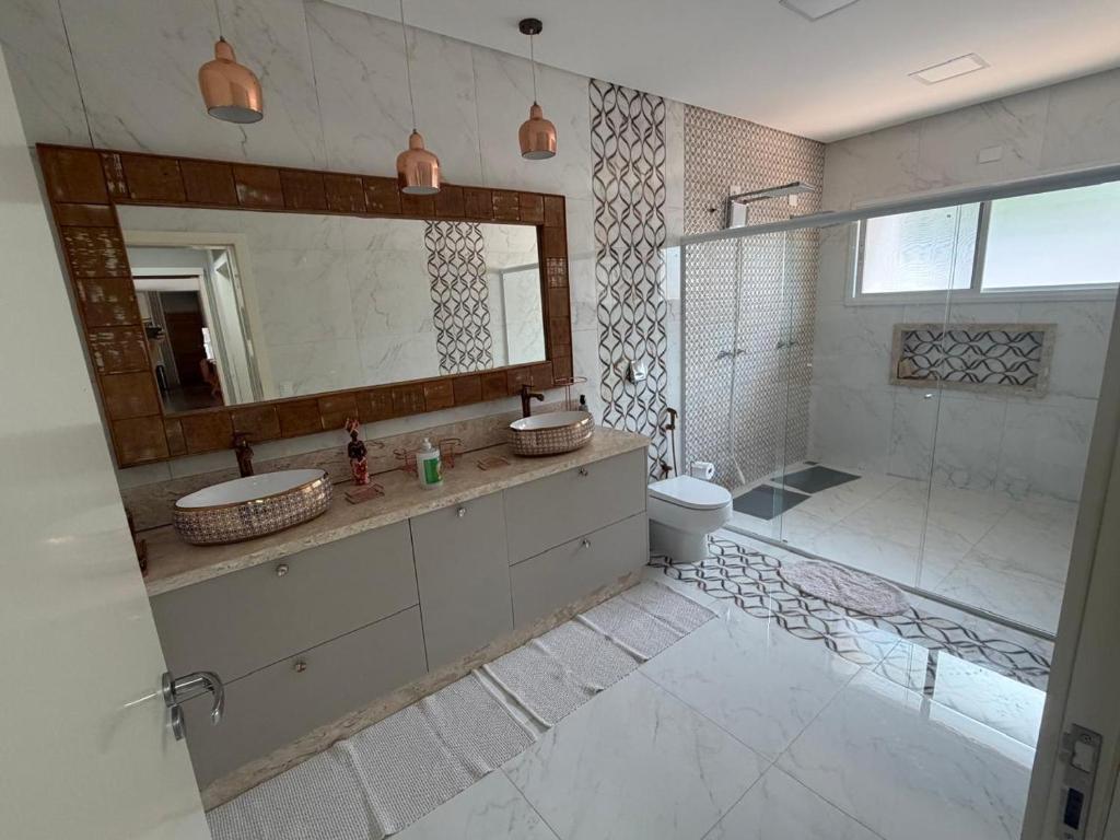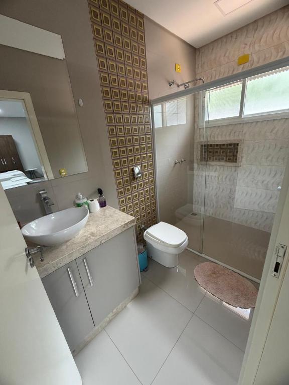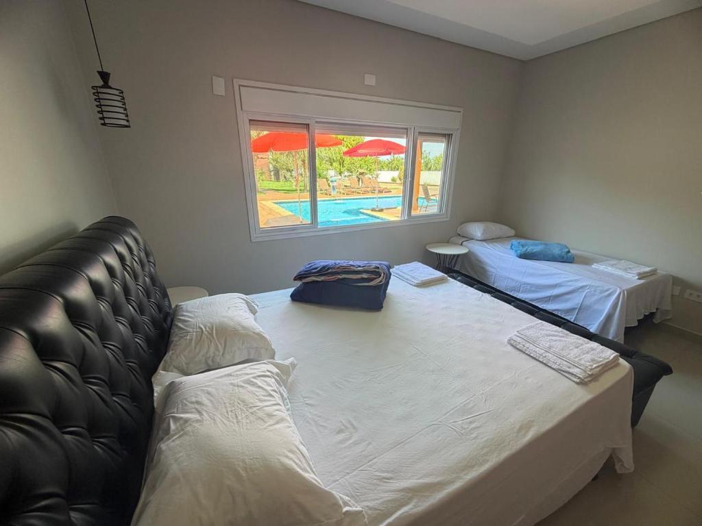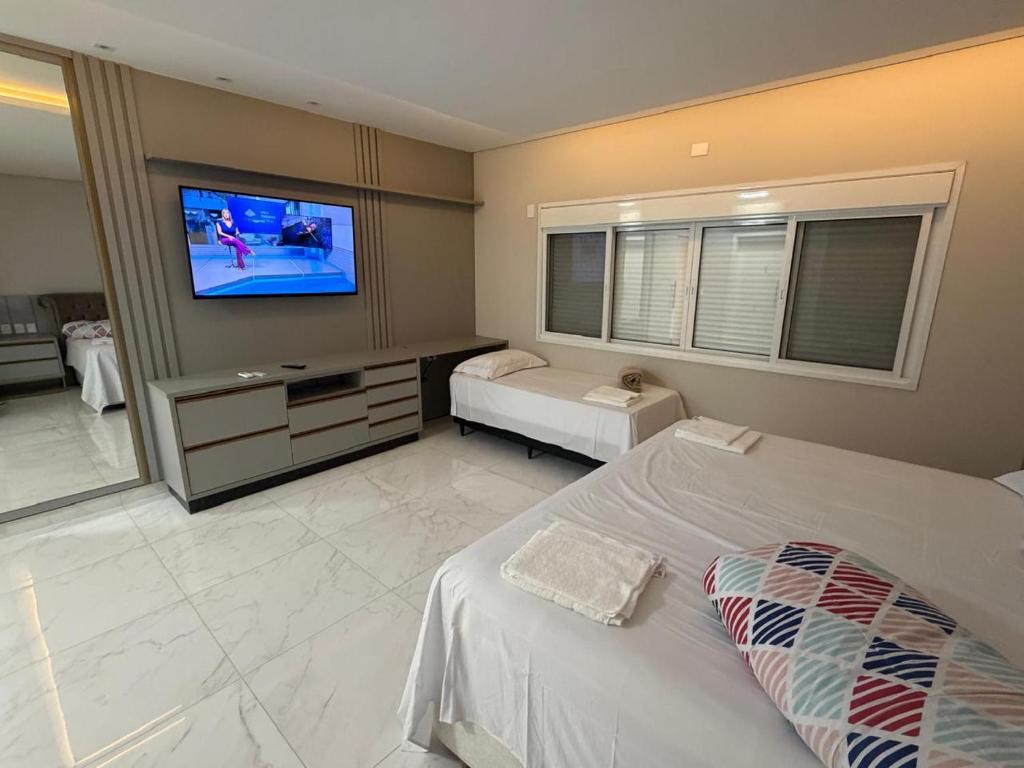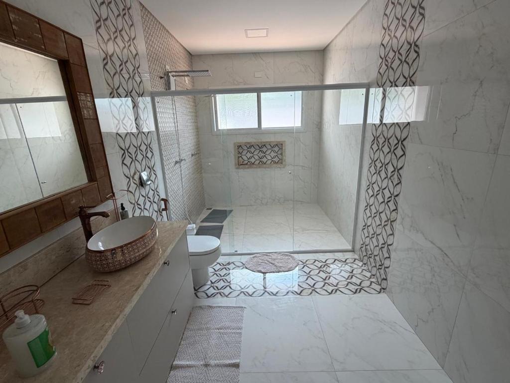 A casa de temporada oferece 3 quartos, 4 banheiros, roupa de cama, toalhas, TV de tela plana, cozinha completa e varanda com vista para a piscina.