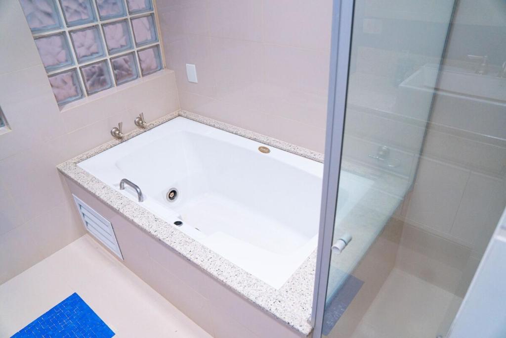 A villa tem 1 quarto, cozinha completa e 4 banheiros.