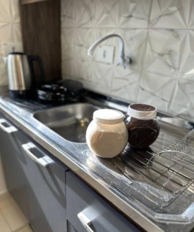 O apartamento tem 2 quartos, cozinha compacta completa e 1 banheiro.