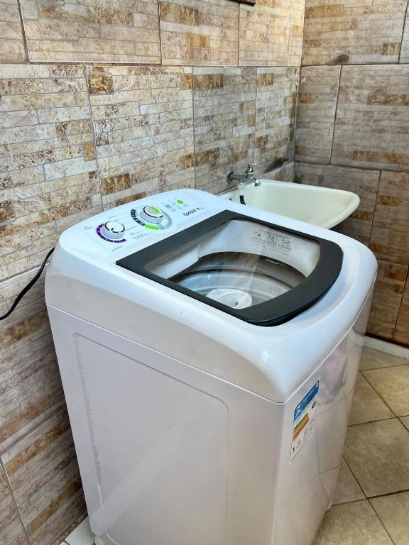 A casa de temporada fica no térreo e tem 1 quarto, uma TV e uma cozinha completa com geladeira, micro-ondas, máquina de lavar roupa e cooktop.