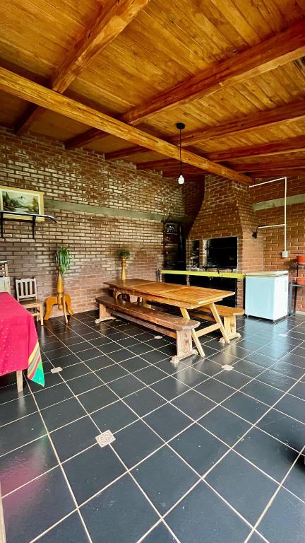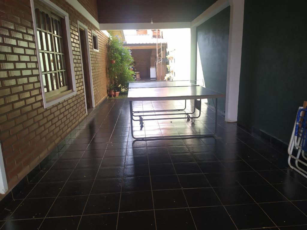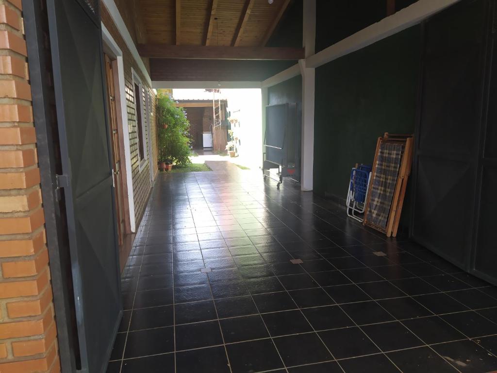 A casa de temporada conta com 2 quartos, 2 banheiros, roupa de cama, toalhas, TV de tela plana, espaço para refeições, cozinha completa e varanda térrea com vista para o jardim.