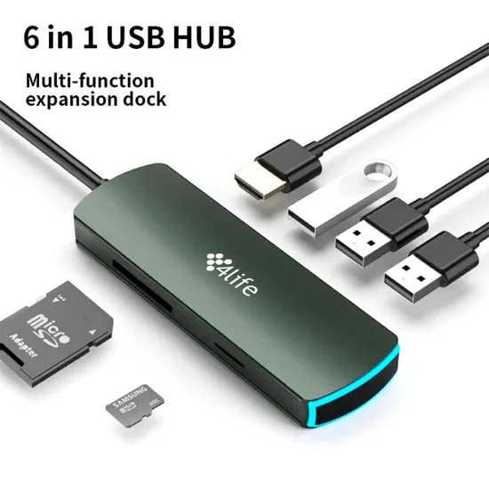 Hub Adaptador Multiporta 4LIFE FLM6AIR / 6 Em 1 / USB-C / 3X USB-C 3.0 / HDMI / SD / TF - Dark Green
