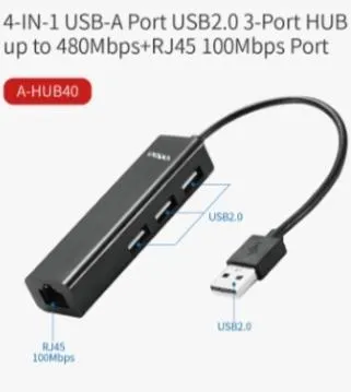 Especificações de Hub USB Sate A-HUB40 4EN1 USB2.0*3/RJ45 100MBS