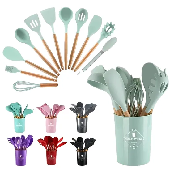 Juego de Utensilios de Silicona Con Mango de Madera 12 Pzas