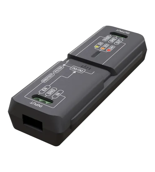 Outra camada de proteção é o TVS: semicondutor supressor de voltagem transiente. Essa combinação de camadas protege seus dispositivos de picos extremos de voltagem. Também adicionamos proteção de polaridade ativa, para que seus dispositivos permaneçam seguros mesmo se você aplicar a energia inversamente por acidente. Além disso, há um filtro passa-baixa integrado para bloquear todos os impulsos indesejados e um fusível padrão para proteção extra.