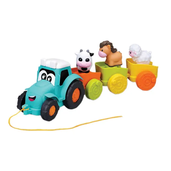 Inclui: 1 trator de rebocar com figuras de animais