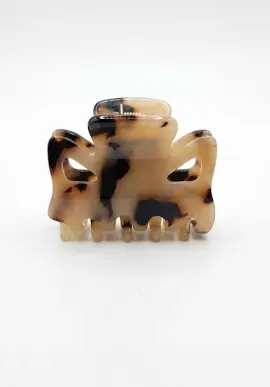 Pinza de sujeción para cabello en tono marrón —puede ser marrón tortuga o café sólido— fabricada en plástico resistente con cierre de muelle firme. El diseño es compacto, ideal para sujetar mechones o recogidos sin dañarlos.