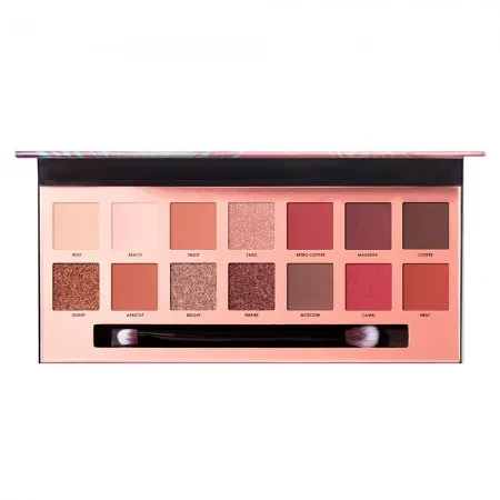 Apresenta uma coleção de sombras essenciais com 14 tons, incluindo tons neutros e berry. Paleta permanente intensa, edição de férias tropicais para criar looks infinitos para o dia e a noite.Altamente pigmento, fórmula fácil de misturar. 11 tons foscos,3 metálicos.Dual- escova lateral de cerdas macias.