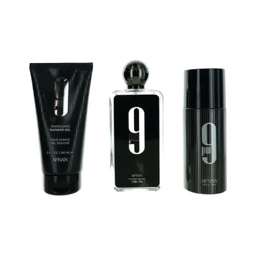 El Afnan 9PM Black Men es una fragancia muy apreciada dentro de los perfumes árabes por su intensidad y larga duración, convirtiéndose en una excelente opción para eventos especiales, salidas nocturnas o momentos en los que se desea destacar con un aroma sofisticado.CARACTERÍSTICASSet de fragancia masculina con aroma oriental dulce y especiado.Perfume con buena fijación y proyección prolongada.Aroma elegante ideal para la noche o eventos especiales.Presentación en kit ideal para regalo.Fragancia masculina moderna con notas cálidas y seductoras.Set completo para disfrutar de la experiencia de la fragancia.NOTAS OLFATIVASNotas de salida: Bergamota, lavanda y manzana.Notas de corazón: Canela, flor de azahar y notas especiadas.Notas de fondo: Vainilla, ámbar, pachulí y haba tonka.CONTENIDO DEL KITEl Afnan 9PM Black Men Kit 3PCS incluye:1 Perfume Afnan 9PM Black Men – 100 ml (Eau de Parfum)1 Desodorante corporal perfumado – 150 ml1 Gel de ducha perfumado – 100 mlMODO DE USOAplicar el gel de ducha durante el baño para perfumar suavemente la piel.Utilizar el desodorante corporal para mantener una sensación de frescura.Aplicar el perfume Afnan 9PM sobre puntos de pulso como cuello y muñecas.Reaplicar según se desee para intensificar el aroma.