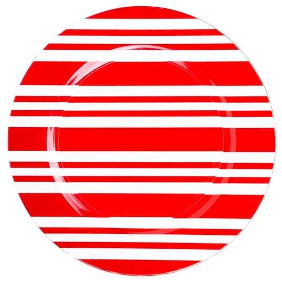Prato Redondo Natalino Plástico Vermelho com Listras Brancas 33CM
