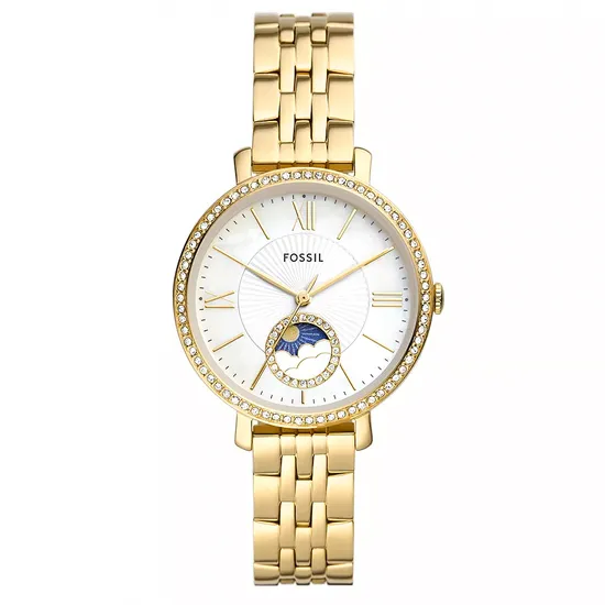 Movimento multifuncional solar e lunar e bracelete de aço inoxidável em tom dourado.