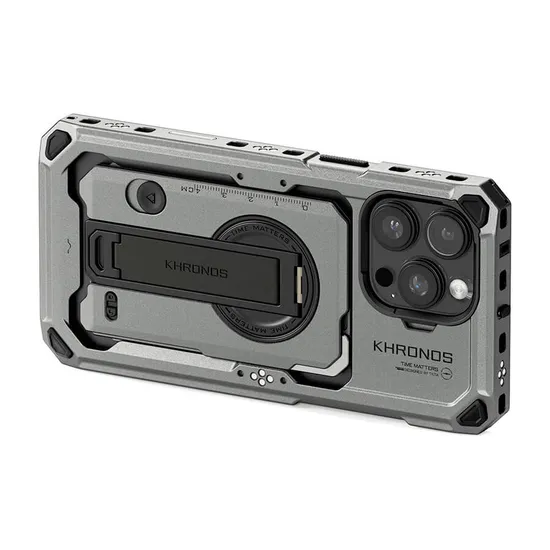 O case Khronos apresenta pontos de contato eletrônicos integrados em toda a sua extensão, permitindo que a energia passe pela gaiola para alimentar acessórios compatíveis ao usar um punho de energia opcional. A barra de toque de controle da câmera, permite acesso total à funcionalidade da barra de toque no iPhone 16 Pro.
