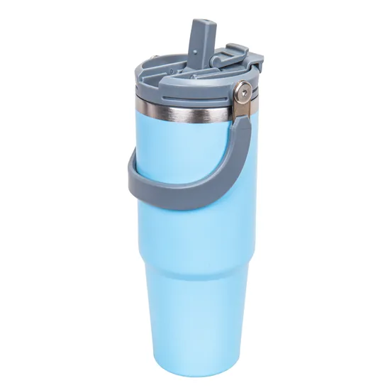 Vaso térmico de grande capacidade com elegante acabamento em cor azul pastel, ideal para conservar bebidas frias ou quentes por várias horas. Inclui uma prática tampa rosqueável com sistema de despejo e uma robusta alça dobrável que facilita seu transporte. Fabricado em aço inoxidável e plástico de alta resistência para uso diário no escritório, carro ou atividades ao ar livre. Perfeito para café, chá, sucos ou água durante todo o dia.