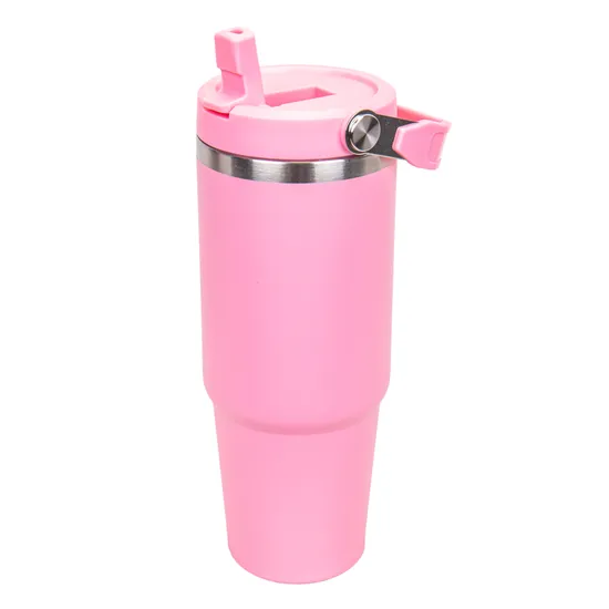 Vaso térmico de grande capacidade com elegante acabamento em cor rosa pastel, ideal para conservar bebidas frias ou quentes por várias horas. Inclui uma prática tampa screw-on com sistema de despejo e uma robusta alça dobrável que facilita o transporte. Fabricado em aço inoxidável e plástico de alta resistência para uso diário no escritório, carro ou atividades ao ar livre. Perfeito para café, chá, sucos ou água durante todo o dia.