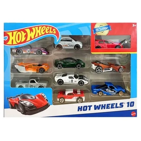Pacote com 10 veículos Hot Wheels variados.