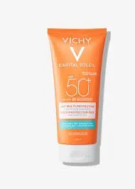 - Ofrece una alta protección solar SPF50+ gracias a su fórmula enriquecida con filtros de amplio espectro UVA/UVB asociado al agua termal de Vichy
