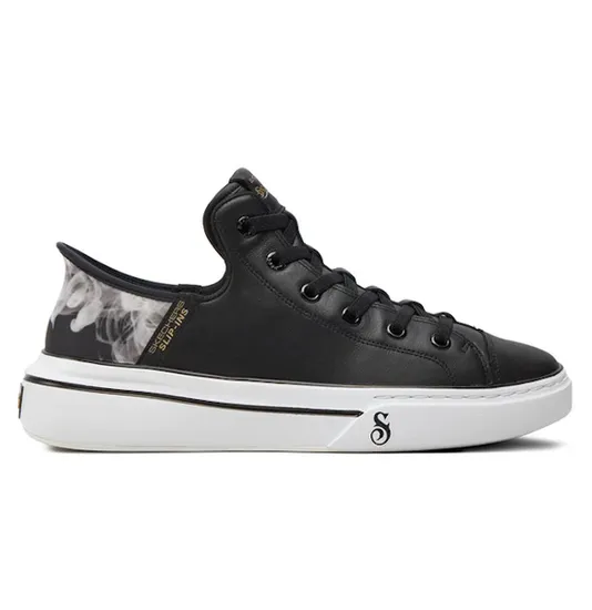 Cuenta con una parte superior de cuero suave con cordones flexibles y un talón con estampado de humo.