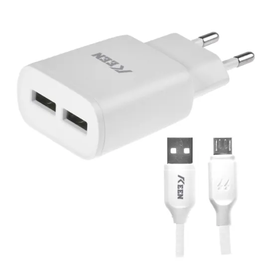 Carregador / Adaptador de Parede Keen KC-01 Auto-Id + Cabo Micro-USB / 2X USB-A / 5V/ 2.4A - Branco