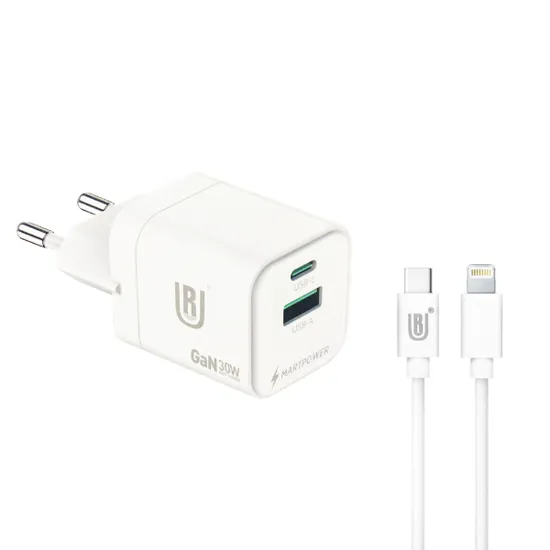 Carregador / Adaptador de Parede Ur UA-11 / 30W / USB-A / USB-C / com Cabo USB-C para Lightning - Branco