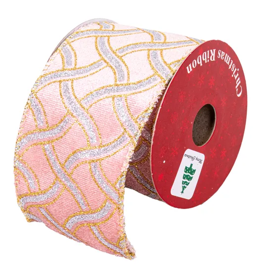 Fita Decorativa de Natal Rosa com Desenho Ondulado de Glitter Dourado e Prateado 6 CM X 2,7 M