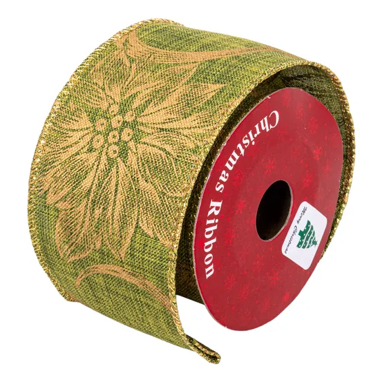 Fita Decorativa de Natal Verde com Desenho de Flor de Poinsétia Dourada 6 CM X 2,7 M