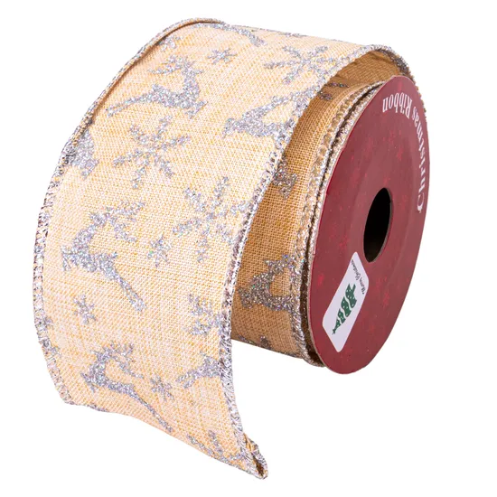 Fita Decorativa Natalina Bege com Renos e Floquinhos de Neve Prateados 6CM X 2,7M