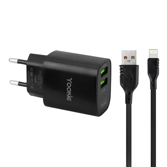 Fonte Carregador Yookie KI96Y - 2X USB - com Cabo USB/Lightning - Bivolt - Preto
