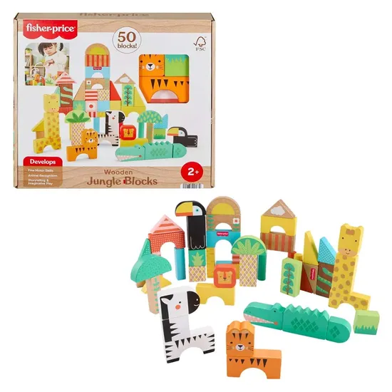 Fabricado com madeira proveniente de fontes bem geridas e certificadas pelo Forest Stewardship Council (FSC-N004566), este conjunto de 50 blocos proporciona uma experiência de jogo segura, resistente e educativa. As crianças podem construir seis animais exóticos diferentes —crocodilo, girafa, leão, zebra, tucano e tigre— ou misturar os blocos para inventar novas criaturas, promovendo a motricidade fina, a criatividade e o reconhecimento de animais. As cores e a decoração podem variar, tornando cada conjunto único.