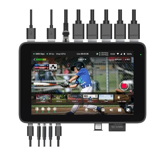 O Ultra possui quatro entradas HDMI, uma USB-C e duas entradas USB-A para conexão com várias câmeras ou dispositivos. Uma CPU Qualcomm 865 integrada melhora o desempenho da transmissão ao vivo e uma tela LCD sensível ao toque com brilho de 650 cd/m² melhora a visibilidade. O Ultra pode transmitir por até 8 horas seguidas graças à bateria integrada de 6.800 mAh.Atualização v1.40Agora suporta gravação ISO para entradas HDMI, USB, NDI e SRTConecte até três entradas NDI com codificação H.265Suporte para streaming em 2KOrientações horizontais e verticais de transmissão ao vivoAproveitando recursos do YoloBox Pro e Instream, o Ultra é capaz de transmitir ao vivo tanto na orientação paisagem quanto retrato. O streaming horizontal suporta até três destinos simultâneos de até 4K, enquanto o streaming vertical suporta até dois destinos simultâneos. Ultra transmite ao vivo via protocolos RTMP, RTMPS, MJPEG, NDI e SRT para compatibilidade com plataformas populares como YouTube, Facebook, Twitch, Instagram e TikTok. Você pode até instalar aplicativos de terceiros diretamente no monitor.Poder de processamento aprimoradoUm processador Qualcomm CPU 865 integrado mantém transmissões ao vivo nítidas com atrasos mínimos e ótima qualidade visual. O processador oferece desempenho de CPU 2,5x e desempenho de GPU 4x com 8 GB de RAM e 128 GB de ROM.Recursos de vídeo abrangentesCapturarAs gravações ISO capturam todas as entradas de vídeo, bem como o vídeo do programa, e os salvam como arquivos separados. Ajuste a resolução, a taxa de quadros e a taxa de bits de cada gravação conforme necessário.O Ultra pode transmitir e gravar conteúdo simultaneamente. Codifique seu vídeo e áudio e salve-os no cartão SD inserido ou SSD portátil quando a função de gravação estiver habilitada.MudarA troca automática seleciona fontes e durações de vídeo e alterna automaticamente entre elas para produções multicâmeras de uma única pessoa.Transições de vídeo como cortar, esmaecer, apagar e aplicar zoom tornam a alternância entre fontes mais atraente visualmente.Existem vários layouts de visualização múltipla disponíveis para você escolher, incluindo Picture in Picture, Side by Side, Split View, News Layout e Triple.O chroma key integrado adiciona fundos diferentes à sua produção ao vivo.Convide até cinco pessoas para participar da sua transmissão e criar sessões colaborativas e remotas.MonitorSobreposições gráficas como imagens, terços inferiores, marcadores, cronômetros de contagem regressiva, sobreposições de URL da web e outros arquivos específicos da marca adicionam um toque profissional.Importe gráficos PNG, JPG e GIF.Ampla conectividade de dispositivosCapture vídeo de até quatro fontes de entrada HDMI, como câmeras DSLR ou sem espelho, três fontes de entrada USB, como webcams ou câmeras de documentos, e envie esse vídeo para seu computador pessoal ou monitor. Alterne entre 10 ou mais fontes de vídeo com facilidade. Grave vídeo em um cartão SD ou transmita-o por meio de um dongle Wi-Fi conectado. As entradas integradas de linha e microfone de 3,5 mm podem ser mixadas com a interface de mixagem de áudio integrada.Interface de link celularWi-Fi 6, Ethernet RJ45, modem USB-C e conectividade 4G LTE no Ultra facilitam a conexão celular. Com a compra de um cartão SIM disponível separadamente e da assinatura do YoloLiv Network Bonding, seu Ultra desbloqueia a conectividade global com a Internet onde quer que você escolha transmitir.Entrada 1 - HDMI IN 1: Entrada de vídeo2 - HDMI IN 2: Entrada de vídeo3 - HDMI IN 3: Entrada de vídeo4 - HDMI IN 4: Entrada de vídeo5 - SAÍDA HDMI: Saída de vídeo para monitor ou computador para reuniões Zoom/Skype6 - PORTA ETHERNET: Conecte-se à Internet usando um cabo Ethernet7 - USB tipo A 3.0: entrada de vídeo(Suporte: webcam; dispositivo de armazenamento portátil; dongle USB sem fio).8 - USB tipo A 3.0: entrada de vídeo(Suporte: webcam; dispositivo de armazenamento portátil; dongle USB sem fio).9 - USB tipo C: somente para carregamento10 - LINE IN (3,5 mm): estéreo, conexão para guitarra elétrica ou sintetizador11 - MIC IN (3,5 mm): Mono, conecte ao microfone para gravar12 - AUDIO OUT (3,5 mm): conexão com fones de ouvido de monitor· Nível 3 da EPA· Nível 4 da EPA· Regulamentos da EPA13 – USB Type-C: Uma interface totalmente funcional suporta entradaOrifício de parafuso de 14 - 1/4'': Montagem Ultra com câmera15 - Porta-cartão Nano-SIM: insira o cartão SIM para conectar-se à Internet16 - Porta cartão SD: Utilizado para gravar e carregar gráficos.17 - Botão liga / desliga: liga e desligaCaracteristicasPotência de entradaDC5V/9V/, 12V/15VConsumo de energia45WFonte de energiaUSB Tipo CSaída nominal USBUSB-A:5V/1ACapacidade da bateria6800mAhTamanho da tela do monitorResolução LCD de 8 polegadas: 1200*1920; Brilho: 650nits;Taxa de contraste (1500:1), Ângulo de visão (ângulo de visão total), NTSC 80%Entradas de vídeo locaisHDMI, USB-AVídeo sobre EthernetRTMP/RTMPS/SRTConectores de entrada de vídeoHDMI, USB-A, RJ-45, USB Tipo CProporções de aspecto de entrada de vídeo16:9; 4:3; 1:1Desentrelaçamento de entrada de vídeoNãoResolução de entrada de vídeo de transmissão ao vivo480p/720p/1080p (até 60 fps)/4k 30 fpsFormato de vídeo codificadoH.264 H.265Processamento de vídeo Controle de taxa de bitsCQ, VBR, CBRCodificação de vídeo acelerada por hardwareOpcionalTipos de sinais de saída de vídeoFLV-RTMP,HDMI,UVCConectores de saída de vídeoSAÍDA HDMI, USB-CProtocolos de streaming de saída de vídeoRTMP, RTMPS, MJPEG, SRTResolução de saída de vídeo de transmissão ao vivo480p/720p/1080p (até 60 fps)/4k 30 fpsConectores de entrada de áudio analógicoEntrada de linha, entrada de microfone, 3,5 mmEntradas de áudio digitalUSB, HDMI, RTMP (da Internet), vídeo local (do cartão SD)Conectores de entrada de áudio digitalUSB-A, HDMI, USB-CEntrada de áudio 